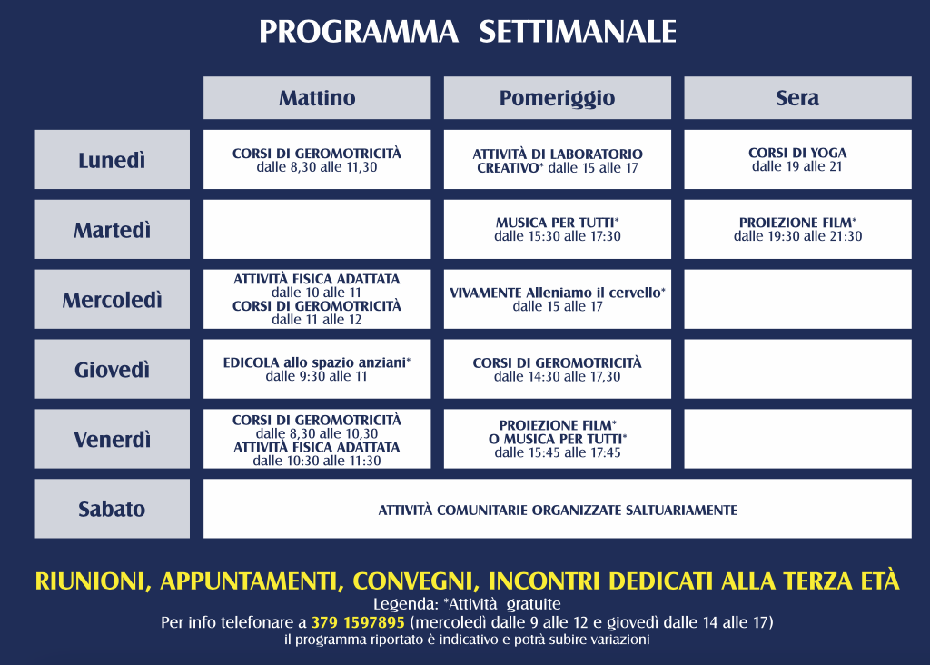Il salone, intitolato a Maria Aimar, benefattrice dell’Ospedale Civile di Busca, si trova tra la Residenza SS. Annunziata e la Casa della Salute, adiacente a piazza Santa Maria. Lo spazio, di oltre 120 metri quadrati, è stato reso polifunzionale grazie al recente rinnovo di arredi e attrezzature ed è dotato di impianto audio-video. Qui verranno proposte attività culturali, sportive e ricreative rivolte agli anziani: molte saranno gratuite, mentre per alcune è prevista una quota di compartecipazione. Sarà quindi possibile vedere un film, partecipare ad un corso di cucina, approfondire le conoscenze informatiche, partecipare ai corsi di ginnastica per mantenersi in forma, partecipare a momenti musicali o divertirsi con i giochi di società. I referenti saranno Alessia Tallone e Andrea Tamalio.