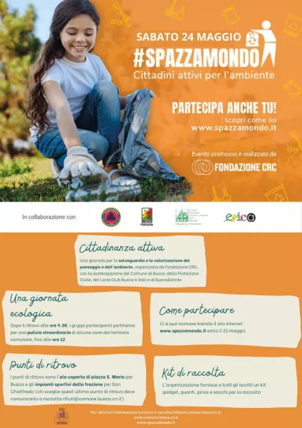 Anche quest’anno la Città di Busca partecipa a “Spazzamondo. Cittadini attivi per l’ambiente”, iniziativa organizzata dalla Fondazione CRC, in collaborazione con Protezione Civile, ANCI Piemonte, UNCEM Piemonte, ANPCI, Cooperativa Erica, i Consorzi ACEM, CEC, CSEA e COABSER e con il patrocinio dell’ufficio Scolastico Provinciale di Cuneo, in programma sabato 24 maggio.