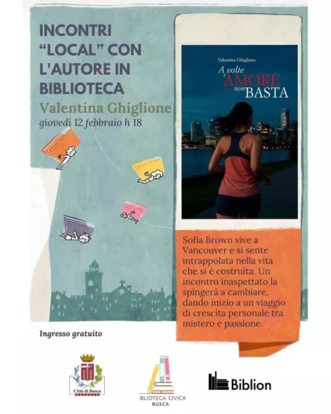 Giovedì 12 febbraio, alle ore 18, la Biblioteca Civica di Busca propone un nuovo appuntamento della rassegna “Incontri Local con l’Autore”. Ospite della serata sarà Valentina Ghiglione, che presenterà il suo libro "A volte l’amore non basta".