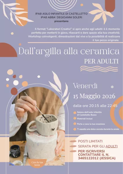 L'IPAB Asilo Infantile di Castelletto e l'IPAB Abbà Degioanni Soleri, venerdì 15 maggio, dalle ore 20.15 alle 22.45, nel Salone dell'asilo infantile di Castelletto Busca, presentano il format "Laboratori Creativi" aperto anche agli adulti: è il momento perfetto per metterti in gioco, rilassarti e dare spazio alla tua creatività.