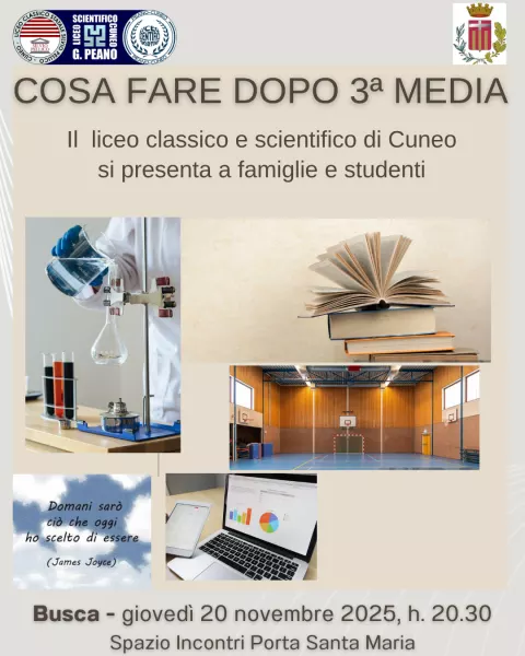 Giovedì 20 novembre, alle ore 20:30, il Liceo Classico e Scientifico Statale “Silvio Pellico – Giuseppe Peano” di Cuneo presenterà allo Spazio Incontri Porta Santa Maria la propria offerta formativa, illustrando indirizzi, metodi di studio e opportunità didattiche. Durante l’incontro saranno approfonditi i vari percorsi liceali – classico, scientifico, scienze applicate, sportivo ed EsaBac – e spiegato come la formazione liceale fornisca una solida base culturale e prepari con efficacia all’università e al futuro professionale. Il pubblico potrà dialogare con il Dirigente Scolastico, incontrare i docenti e ascoltare l’esperienza diretta degli studenti buschesi che già frequentano il liceo. Un’occasione per porre domande, chiarire dubbi e conoscere la scuola attraverso la voce di chi la vive ogni giorno.