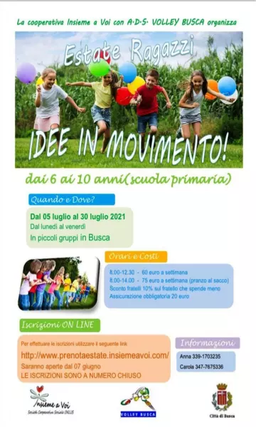 La Cooperativa Insieme a voi con l'associazione sportiva Volley Busca, in collaborazione con il Comune, organizzano "Idee in movimento" estate ragazzi per bambini dai 6 ai 10 anni, che si svolgerà dal 5 al 30 luglio, dal lunedì al venerdì ,in piccoli gruppi. Gli orari sono dalle 8 alle 12:30 (60 ero a settimana) e dalle 8 alle 14 75 euro a settimana, con pranzo al sacco, sconto per fratelli al 10% sul fratello che spende meno e assicurazione obbligatoria di 20 euro)