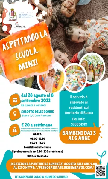 Aspettando la scuola” si svolge dal 28 agosto all’8 settembre, dal lunedì al venerdì, per tutti i ragazzi residenti nel comune di Busca; si tiene nel salone della Croce Rossa (corso Romita) con orari 8-12,30; oppure 8-14 con pranzo al sacco e possibilità di effettuare il pre-ingresso alle ore 7:30 al costo di 20 euro alla settimana (30 con il pre-ingresso). Le iscrizioni da lunedì 21 agosto alle ore 9 sul sito www.prenotaestate.insiemeavoi.com ; informazioni tel. 378.3013111.