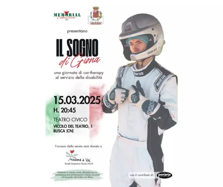 Il Comune di Busca ospiterà, sabato 15 marzo 2025 alle ore 20.45, presso il Teatro Civico di Busca, la proiezione del docu-film “Il sogno di Giona”, realizzato dall’Associazione Memorial Cristian Zucconi APS. Il film racconta con uno sguardo poetico l’esperienza vissuta durante la prima edizione del “Car Therapy Day”, un evento dedicato ai ragazzi con disabilità delle associazioni dell'Alessandrino, che ha permesso loro di vivere l’emozione del rally e del drifting in un contesto sicuro e inclusivo.