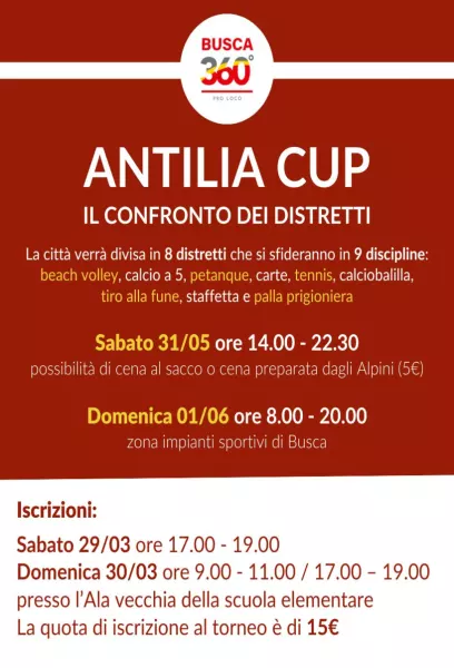 Per ulteriori informazioni contattare Martina 345 6075702 oppure segui i canali social della Pro Loco Busca 360 e il profilo Instagram dedicato @antilia.cup.
