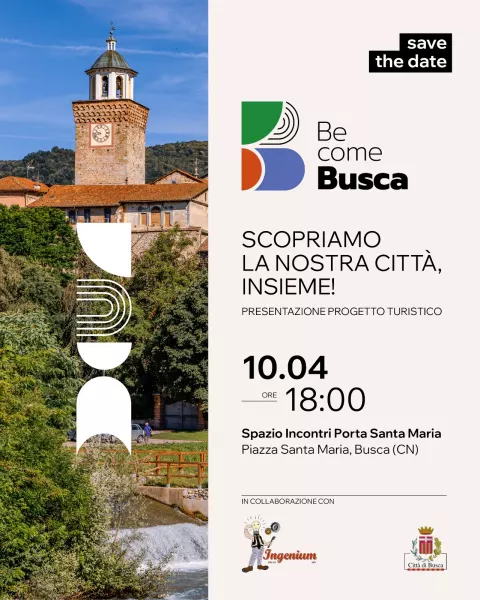 Giovedì 10 aprile alle ore 18, presso lo Spazio Incontri Porta Santa Maria, si terrà la presentazione del progetto turistico “Be Come Busca”: un incontro aperto a tutti per illustrare il percorso di valorizzazione territoriale promosso dal Comune di Busca in collaborazione con l’associazione Ingenium.