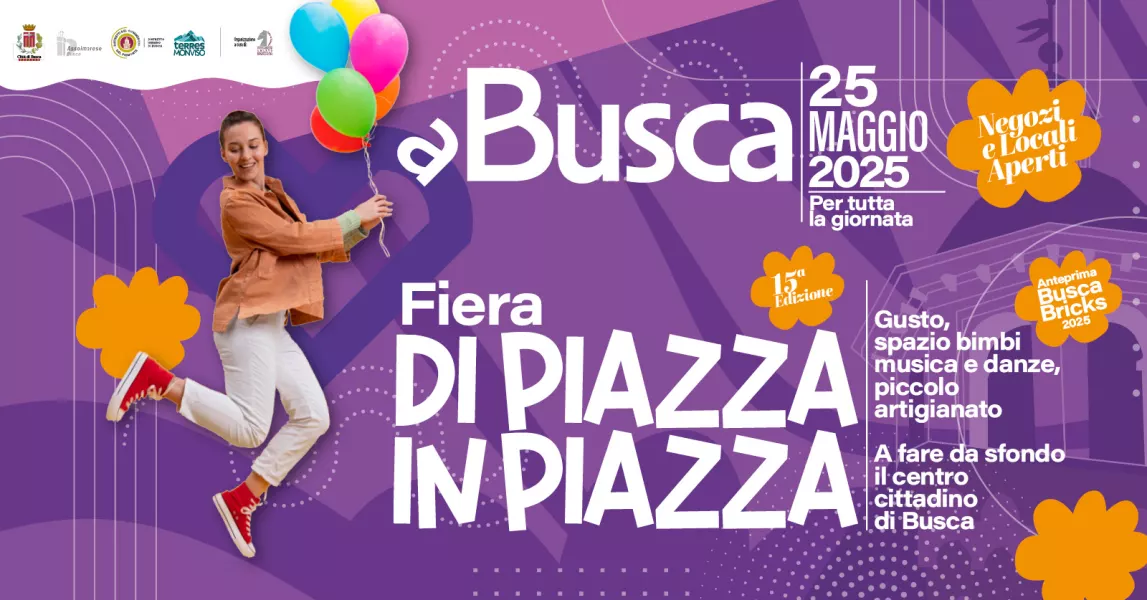 Anche quest’anno si rinnova la collaborazione tra la Città di Busca, Assoimprese e la Fondazione Amleto Bertoni e si inizia con l’evento che tradizionalmente anima l’ultima domenica di maggio: le quattro piazze protagoniste – Piazza Regina Margherita, Piazza Savoia, Piazza della Rossa e Piazza Santa Maria – si trasformeranno in luoghi d’incontro, esplorazione e intrattenimento. Ogni piazza racconterà anime differenti del territorio: artigianato locale, fiori, musica, giochi tradizionali, i gusti della gastronomia, la scoperta della natura circostante e tanto altro ancora.