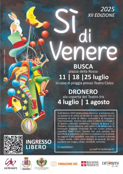La collaborazione ormai consolidata con Santibriganti Teatro di Moncalieri, attiva dal 2011, porterà anche quest’estate a Busca la rassegna Sì di Venere, in programma nei venerdì 11, 18 e 25 luglio. Una vera esplosione di risate, acrobazie e meraviglia, pensata per coinvolgere grandi e piccini, con gli affascinanti spettacoli di arte di strada che animeranno gli spazi del centro storico.