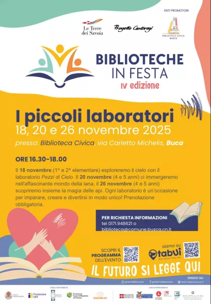 Nell’ambito dell’edizione 2025, in programma dal 15 al 30 novembre, la Biblioteca Civica di Busca parteciperà con l’iniziativa “I piccoli laboratori”, tre appuntamenti dedicati ai bambini, che si terranno il 18, 20 e 26 novembre, dalle 16.30 alle 18.00, nella sede di via Carletto Michelis.