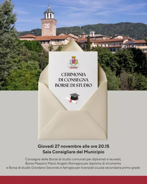 Giovedì 27 novembre alle ore 20.15 in Sala Consigliare del Municipio, consegna delle Borse di studio cumunali per diplomati e laureati, Borsa Maestro Mario Angelo Romagna per diploma di strumento e Borsa di studio Giordano Secondo e famiglia per licenziati scuola secondaria primo grado.