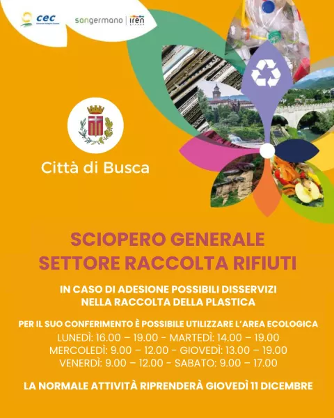 Si avvisa la cittadinanza che mercoledì 10 dicembre è previsto uno sciopero generale del settore raccolta rifiuti. Nel corso della giornata, in cui è prevista la raccolta della plastica, potrebbero verificarsi disservizi in caso di adesione degli operatori.