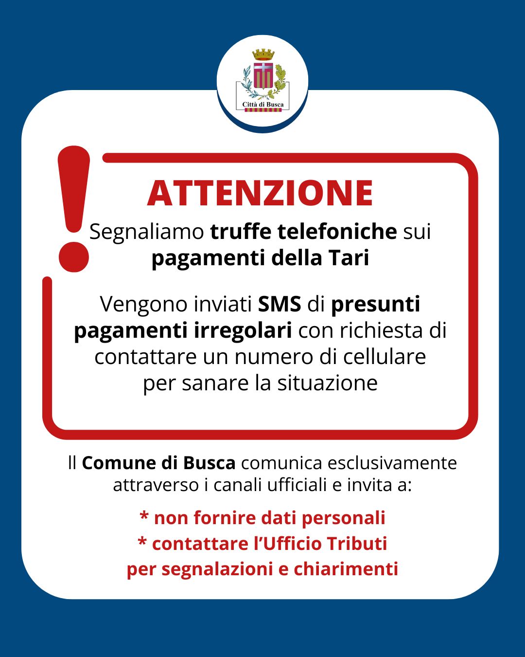 Il Comune di Busca raccomanda di non fornire mai dati personali e di prestare la massima attenzione. In caso riceveste tali messaggi, vi invitiamo a contattare subito l’Ufficio Tributi al numero 0171 948612 per la segnalazione e chiarire ogni dubbio.