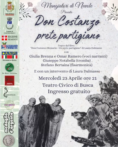 Il primo appuntamento sarà mercoledì 23 aprile ore 21 al Teatro Civico di Busca con la lettura drammatizzata “Don Costanzo – prete partigiano”, a cura dell’associazione Mangiatori di Nuvole, uno spettacolo scritto, diretto e interpretato da Giulia Brenna e Omar Ramero, con l’accompagnamento musicale dal vivo di Giuseppe Notabella alla tromba e Stefano Bertaina alla fisarmonica.