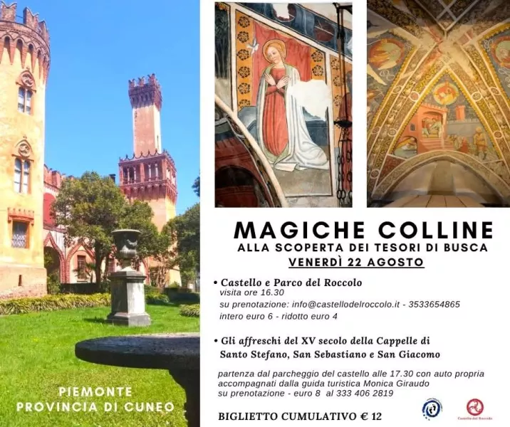 Venerdí 22 agosto apertura straordinaria del Parco e del Castello del Roccolo. La visita potrà proseguire andando alla scoperta degli splendidi affreschi del XV secolo che decorano alcune delle cappelle più antiche presenti sul territorio di Busca: S. Sebastiano, S. Stefano e San Giacomo.
