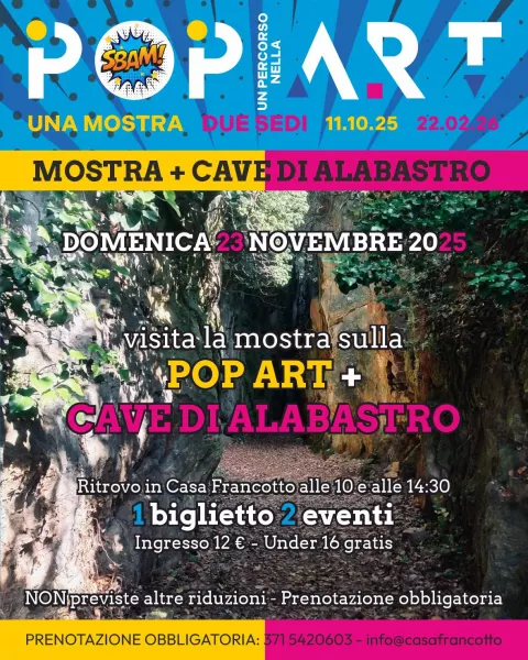 La proposta Mostra + Escursione rientra nell’iniziativa “Un biglietto, due eventi”, che permette di vivere un’intera giornata tra arte e natura con un ticket unico di 12 euro (ingresso gratuito per gli under 16). Un’occasione ideale per scoprire da vicino la Pop Art e approfondire le bellezze del territorio.