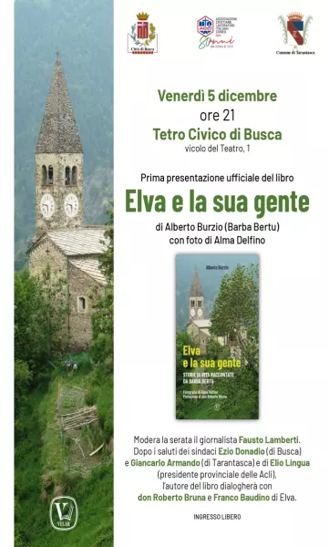 Venerdì 5 dicembre, alle ore 21, il Teatro Civico di Busca ospiterà la prima presentazione ufficiale del libro “Elva e la sua gente” di Alberto Burzio (Barba Bertu), con fotografie di Alma Delfino.