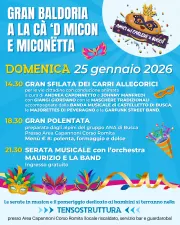 Domenica 25 gennaio Gran Sfilata dei carri allegorici per le vie cittadine e a seguire Gran Polentata preparata dagli alpini e serata musicale