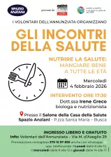 Mercoledì 4 febbraio, alle ore 17.30, presso il Salone della Casa della Salute – Spazio Anziani di Piazza Santa Maria, i Volontari dell’Annunziata propongono un nuovo appuntamento del ciclo "Gli incontri della salute".