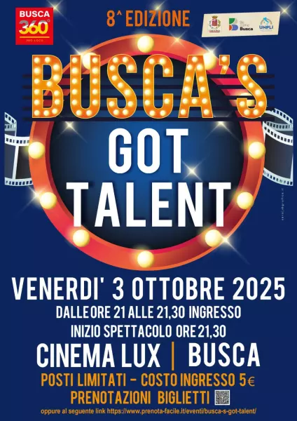 I biglietti si possono prenotare tramite il QR code presente in locandina oppure al seguente link: https://www.prenota-facile.it/eventi/busca-s-got-talent/