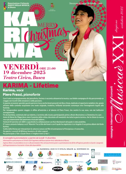 Il concerto che chiude il 2025 ha per protagonisti una voce e un pianoforte: il titolo è Lifetime, la voce è quella straordinaria di Karima, il pianoforte è nelle mani di Piero Frassi, anche arrangiatore.