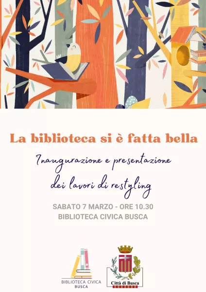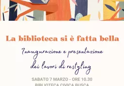 Sabato 7 marzo, alle ore 10.30, la Biblioteca civica di Busca invita la cittadinanza all’inaugurazione del restyling dei locali: un intervento di ritinteggiatura e valorizzazione degli spazi con l’inserimento di una decorazione murale artistica nell’ingresso, che ha donato nuova luce e nuova energia agli ambienti.