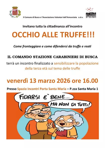 Venerdì 13 marzo ore 16.00 presso lo Spazio Incontri Santa Maria, il Comando della stazione dei Carabinieri di Busca terrà un incontro per sensibilizzare la popolazione della terza età sul tema delle truffe.
