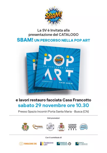 Sabato 29 novembre alle ore 10.30 presso lo Spazio Incontri Santa Maria verrà presentato il catalogo curato e redatto in occasione della mostra “SBAM! Un percorso nella Pop Art” si snoda tra le sale di Casa Francotto a Busca e gli spazi di Palazzo Salmatoris e della chiesa di San Gregorio a Cherasco, con quasi 200 opere che raccontano un viaggio vibrante attraverso uno dei movimenti più rivoluzionari del XX secolo.