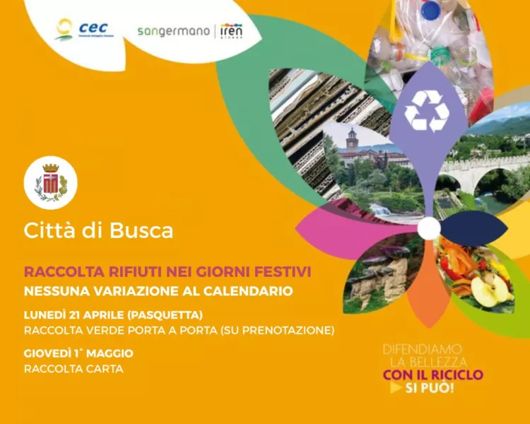 Si informa la cittadinanza che durante le prossime festività infrasettimanali, la raccolta dei rifiuti seguirà regolarmente il calendario in vigore: Pasquetta (lunedì 21 aprile) la raccolta del verde, su prenotazione, e giovedì 1° maggio la carta.