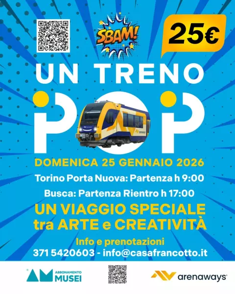 I passeggeri avranno l'occasione di visitare i principali luoghi artistici della città e alla mostra “SBAM! Un percorso nella Pop Art” ospitata a Casa Francotto. Durante il viaggio, i curatori della mostra saranno a bordo per introdurti all’evento espositivo e guidarti nel mondo colorato e irriverente della Pop Art. Per i partecipanti è prevista anche una degustazione dei prodotti tipici locali.