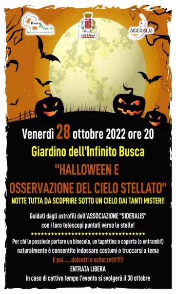 La neonata associazione  Sideralis, costituita da appassionati astrofili, insieme con l’associazione Busca&Verde,  propone un evento aperto a tutti gratuitamente  per la sera di venerdì 28 ottobre da titolo “Halloween al parco Giardino dell'Infinito. Un viaggio nella storia accompagnati dalle stelle” durante la quale sarà illustrata la storia e il  significato di Halloween e si potrà osservare la volta celeste e le sue costellazioni. Le luci pubbliche che circondano il giardino saranno spente, per una migliore osservazione.