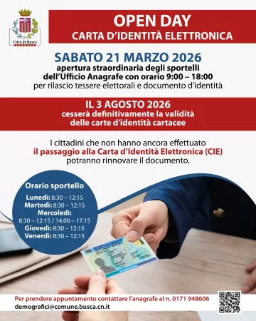 Sabato 21 marzo, in vista del referendum del 22 e 23 marzo, l’Ufficio Anagrafe del Comune di Busca garantirà l’apertura straordinaria degli sportelli dalle ore 9.00 alle ore 18.00. In questa occasione, i cittadini che non hanno ancora effettuato il passaggio alla Carta d’Identità Elettronica (CIE) potranno rinnovare il documento.