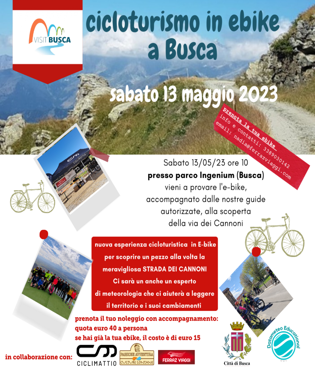L’associazione Datameteo Educational, con il patrocinio dela Città e in collaborazione  l’ associazione Ingenium, presenta  l’iniziativa “Busca balloon&e-bike” per sabato prossimo 13 maggio. Al volo in mongolfiera con  John Aimo dal museo parco dell’Ingenio  seguirà la proposta di un percorso ciclo-turistico e naturalistico aperto a tutti in e-bike con la guida ciclo-naturalistica Nadia e il “biker meteorologo” Cristian.