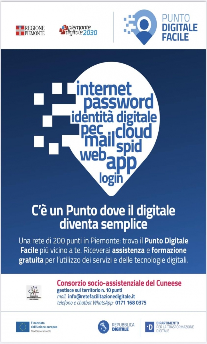 Il progetto “Reti di facilitazione digitale” del Consorzio socio-assistenziale del Cuneese, cui aderisce anche il Comune di Busca, istituisce lo sportello di facilitazione digitale aperto dal 15 dicembre ogni due venerdì mattina nei locali del municipio, in via Cavour 28 e lo sportello telefonico aperto tutti i giorni lavorativi che comprende anche il servizio di chatbot, consulenza virtuale erogata tramite WhatsApp al numero di tel. 0171.1680375 oppure a info@retefacilitazionedigitale.it