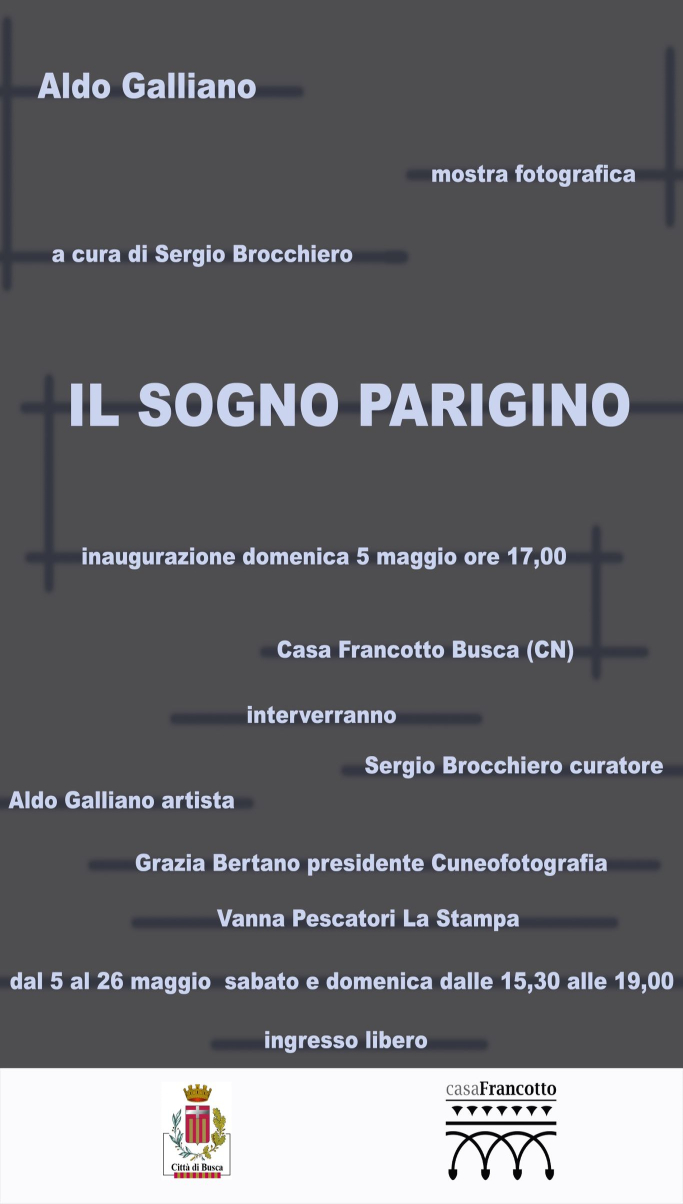 Sarà inaugurata domenica 5 maggio alle ore 17 in Casa Francotto la mostra fotografica Il sogno parigino di Aldo Galliano curata da Sergio Bruchiero. Interverranno l'artista, il curatore, la presidente di Cuneo fotografia Grazia Bertano e la giornalista Vanna Pescatori. La mostra sarà aperta fino al 26 maggio al sabato e alla domenica dalle ore 15,30 alle ore 19 con ingresso libero.