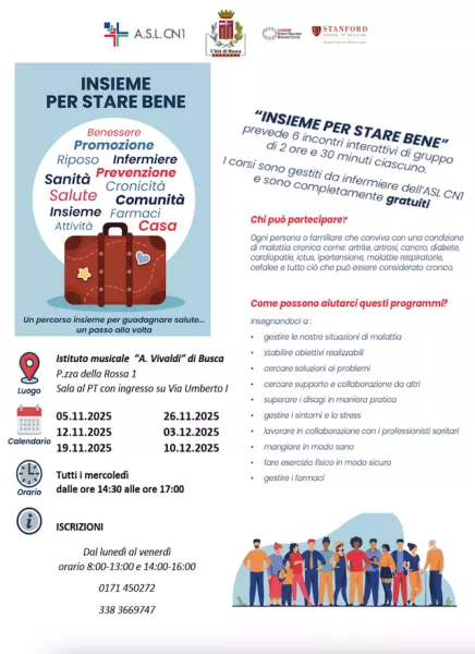Nell’ambito del Piano Locale Cronicità, l’ASL CN1 organizza a Busca il ciclo di incontri “Insieme per stare bene”, seminari interattivi condotti da infermieri formati con un programma sviluppato dall’Università di Stanford.