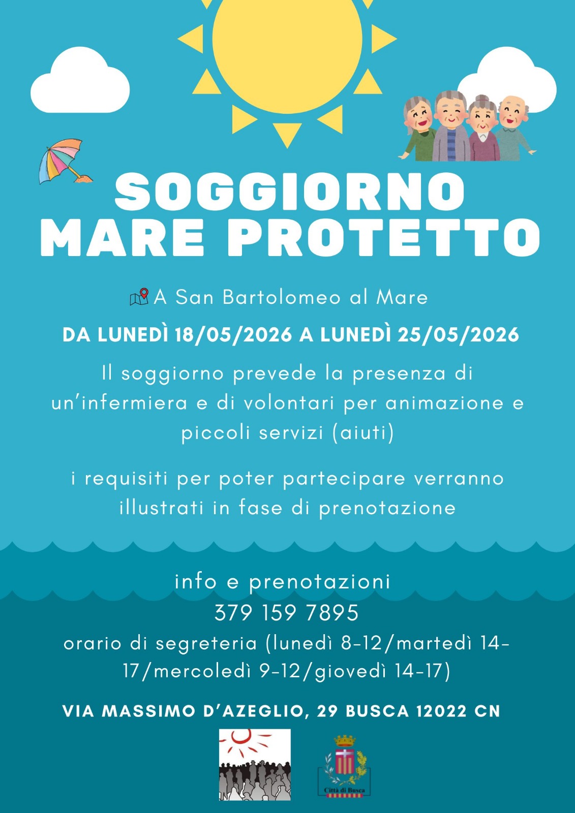 Il viaggio prevede la partenza da Busca in data 18/05/2026 alle ore 14.30 e il rientro da San Bartolomeo al mare in data 25/05/2026 nel pomeriggio. Durante il soggiorno è prevista la presenza di un’infermiera e dei volontari per animazione e aiuto in piccoli servizi.