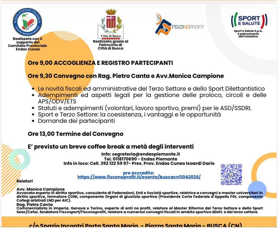 Sabato 11 aprile 2026, si terrà a Busca un importante appuntamento dedicato al mondo dell’associazionismo e dello sport dilettantistico: il convegno “Tra Sport e Terzo Settore”, un’iniziativa gratuita e aperta a tutte le associazioni del territorio.