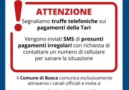 Il Comune di Busca raccomanda di non fornire mai dati personali e di prestare la massima attenzione. In caso riceveste tali messaggi, vi invitiamo a contattare subito l’Ufficio Tributi al numero 0171 948612 per la segnalazione e chiarire ogni dubbio.