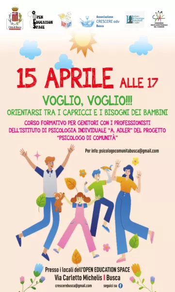 Martedì 15 aprile, ore 17 all’Open Education Space di Busca, si terrà il corso formativo dedicato ai genitori “Voglio, voglio!!! Orientarsi tra i capricci e i bisogni dei bambini".
