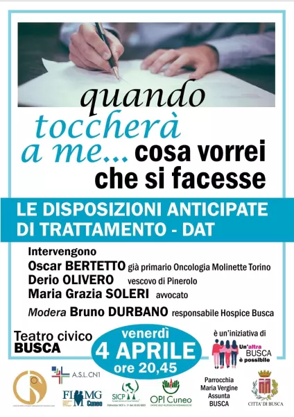 Venerdì 4 aprile ore 20.45 presso il Teatro Civico di Busca, il gruppo "Un’altra Busca è possibile" organizza “Quando toccherà a me… cosa vorrei che si facesse”, serata di approfondimento e riflessione sul tema delle disposizioni anticipate di trattamento (Dat), comunemente definite "testamento biologico" o "biotestamento".