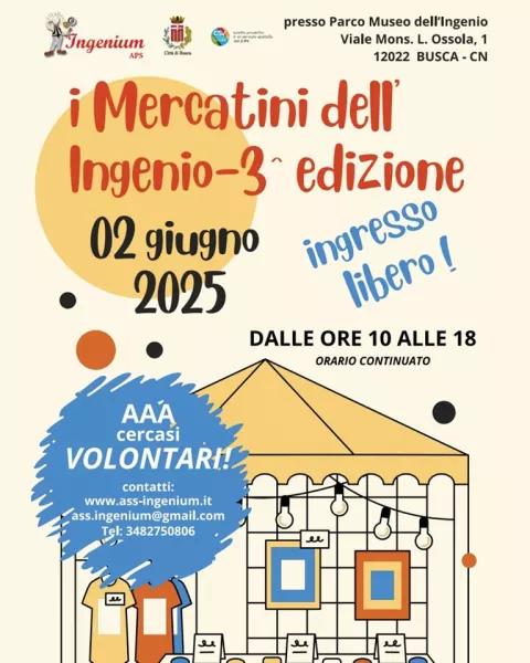 Lunedì 2 giugno nel Parco-Museo dell'Ingegno, dalle ore 10 alle ore 18, avrà luogo la terza edizione dei "Mercatini dell'ingenio", una giornata all'insegna dello svago e della curiosità con espositori hobbisti, l'apertura del museo dedicato alla creatività e che custodisce una collezione permanente di macchinari agricoli e industriali d’epoca, insieme alle creazioni al tombolo della maestra merlettaia Ombretta Audisio.