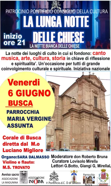 Venerdì 6 giugno, a partire dalle ore 21, presso la Chiesa Parrocchiale Maria Vergine Assunta, quest’anno scelta come sede dell’evento, si svolgerà “La lunga notte delle chiese”.