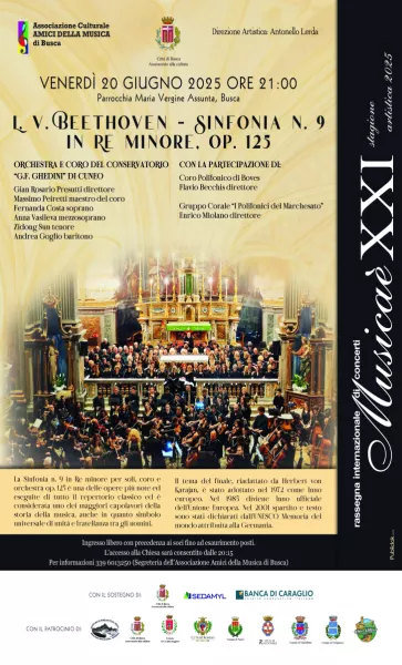 Il concerto, organizzato dall’associazione culturale Amici della Musica per la rassegna internazionale di Concerti “Musicaè” XXI stagione diretta da Antonello Lerda, si terrà venerdì 20 giugno alle ore 21, quando l’Orchestra e il Coro del Ghedini eseguiranno la mastodontica Nona sinfonia di Ludwig van Beethoven.