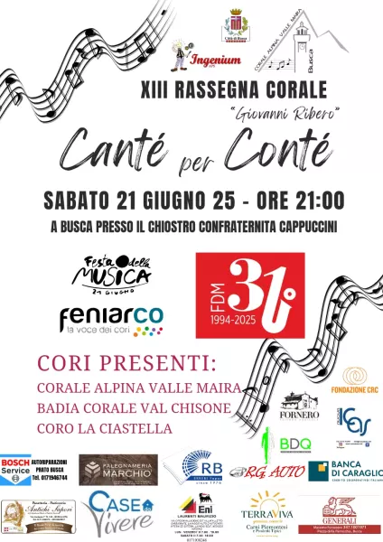 Sabato 21 Giugno 2025, alle ore 21, nel chiostro del convento dei Frati Cappuccini di Busca si terrà la la XIII^ edizione della rassegna corale Giovanni Ribero "Canté per conté" organizzata dalla Corale Alpina Valle Maira di Busca, con il patrocinio della Città di Busca ed il prezioso aiuto dell'associazione Ingenium APS.