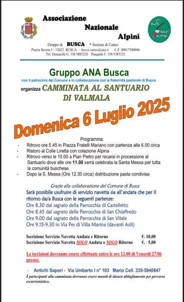 Il Gruppo ANA di Busca, con il patrocinio del Comune e in collaborazione con la fraternità pastorale, organizza per domenica 6 luglio 2025 la tradizionale Camminata al Santuario di Valmala, un appuntamento molto sentito dalla comunità buschese che unisce spiritualità, natura e convivialità.