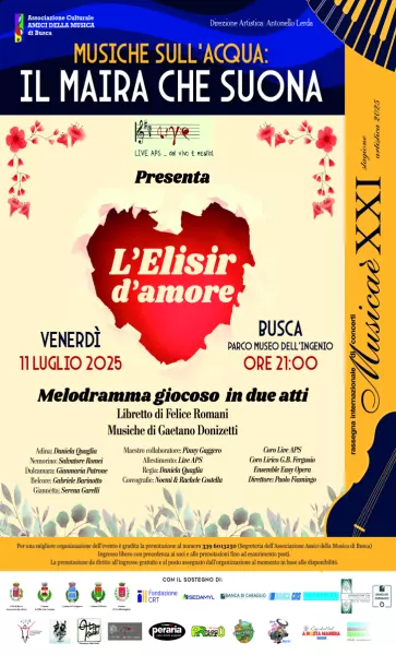 Quest’estate, nell’ambito della sezione Musiche sull’acqua: il Maira che suona che prevede cinque eventi sul corso del Maira da Prazzo a Cavallermaggiore passando per Villar San Costanzo e Vottignasco, l'Associazione Amici della Musica porterà a Busca un’opera lirica: venerdì 11 luglio concerto alle ore 21 al Parco-museo dell'Ingenio andrà in scena L’elisir d’amore di Gaetano Donizetti, opera lirica in due atti con l'Associazione Live APS.