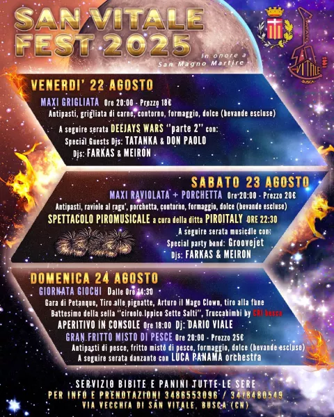 Da venerdì 22 a lunedì domenica 24 agosto in frazione San Vitale di Busca si svolgerà la festa patronale in onore di San Magno Martire organizzata dai volontari del comitato. Spettacolo piromusicale, momenti conviviali e tanto divertimento per tutte le età!