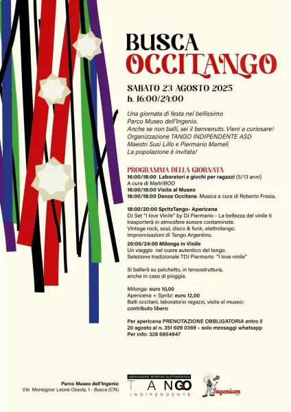 Sabato 23 agosto il suggestivo Parco Museo dell’Ingenio ospiterà "Occitango", un evento speciale organizzato da Tango Indipendente ASD con i maestri Susi Lillo e Piermario Mameli.