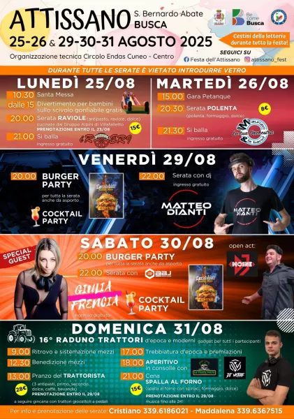 Lunedì 25, martedì 26 e da venerdì 29 a domenica 31 agosto in frazione Attissano, si svolgerà la festa patronale organizzata dai volontari del comitato. Musica, enogastronomia e momenti conviviali per tutte le età!