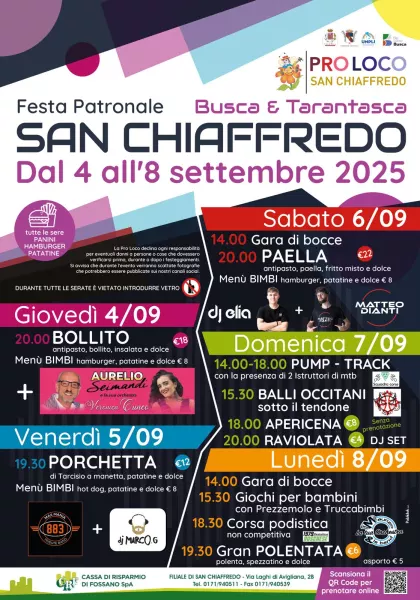 Dal 4 all’8 settembre in frazione San Chiaffredo, Busca e Tarantasca celebreranno la festa patronale organizzata dalla Pro Loco di San Chiaffredo. Cinque giorni di festeggiamenti con musica, sport, enogastronomia per tutte le età!
